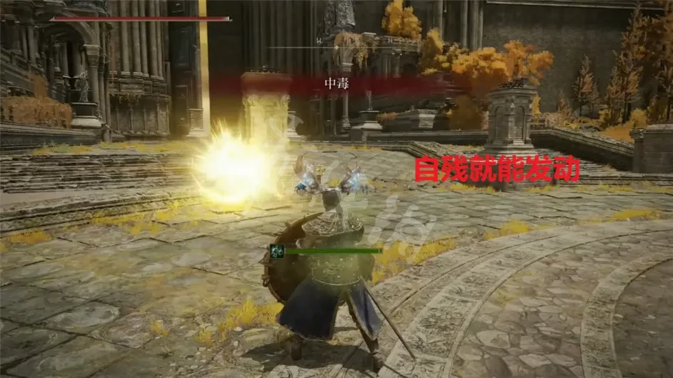 不过在艾尔登法环中,角色自身的一些Debuff状态也算受到了魔法攻击,比如:中毒等等。聪明的你应该已经想到了,我们只要自残,那么就可以通过黄金树大盾对敌人进行魔法攻击!