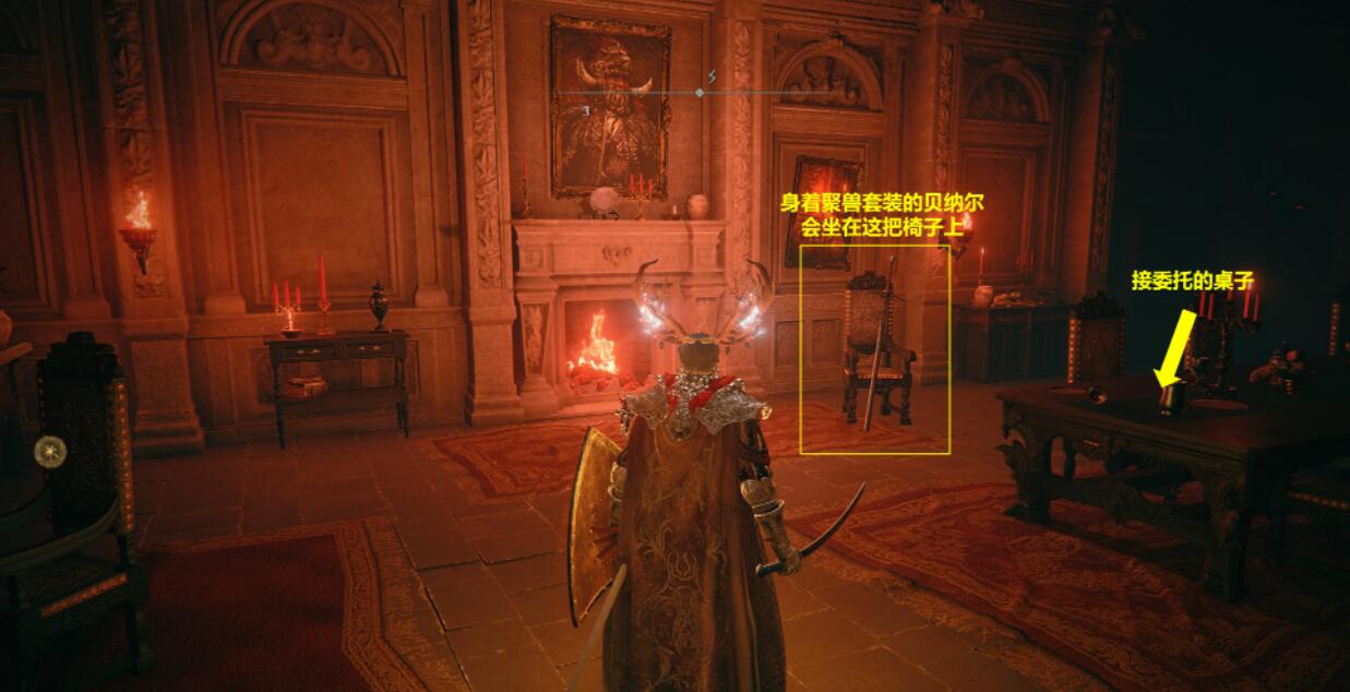 2. 按照火山官邸任务线的流程,我们会在接受委托的屋子里找到贝纳尔,此时他一身重甲坐在椅子上,可以和他对话。