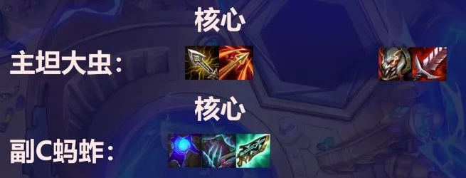 核心无尽+分裂,两件套保证虫子有AOE且不缺伤害,最后一件海克斯有回复的前提下选择泰坦,没有回复的话就饮血,都不差。