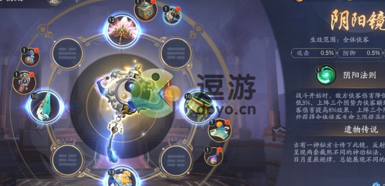 阴阳镜必带,因为元阵容特殊性(同时算作阴阳系侠客)所以3阴(阳)很容易达成甚至可能同时满足,所以阴阳镜附带的减伤,增伤,以及增加最大生命值这些属性极易达成,简直就是为元阵容量身打造,其余的像伏羲琴,鼎这些都可以视情况去携带。