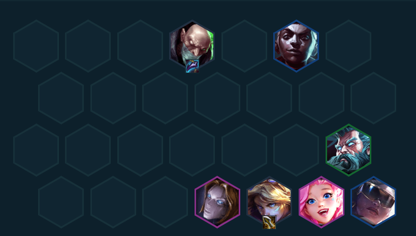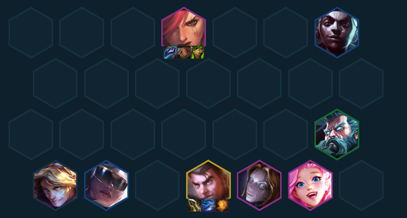 后期决赛圈则找机会上九,可以上纳尔开3名流,也可以单挂二星五费质量卡,希尔科、维克托、塔姆和泽丽都可以。有发明海克斯可以开7发明出发明龙非常猛,有名流海克斯直接开5名流,名流位看情况给蔚和杰斯吃,发条加盾,有真实执法的杰斯和蔚伤害爆炸!