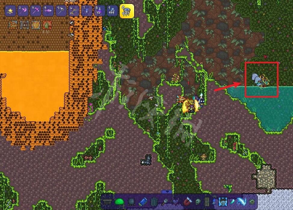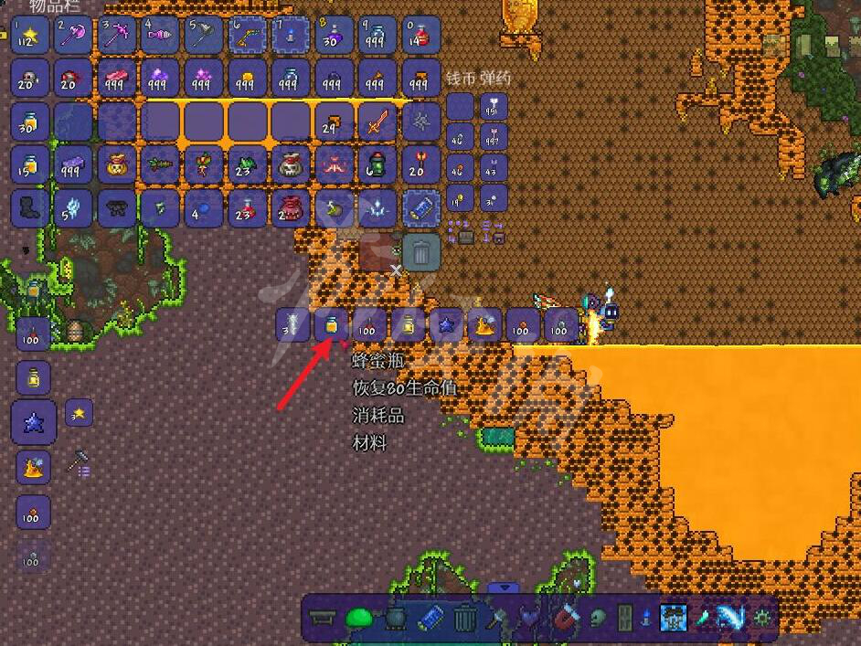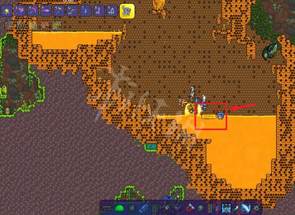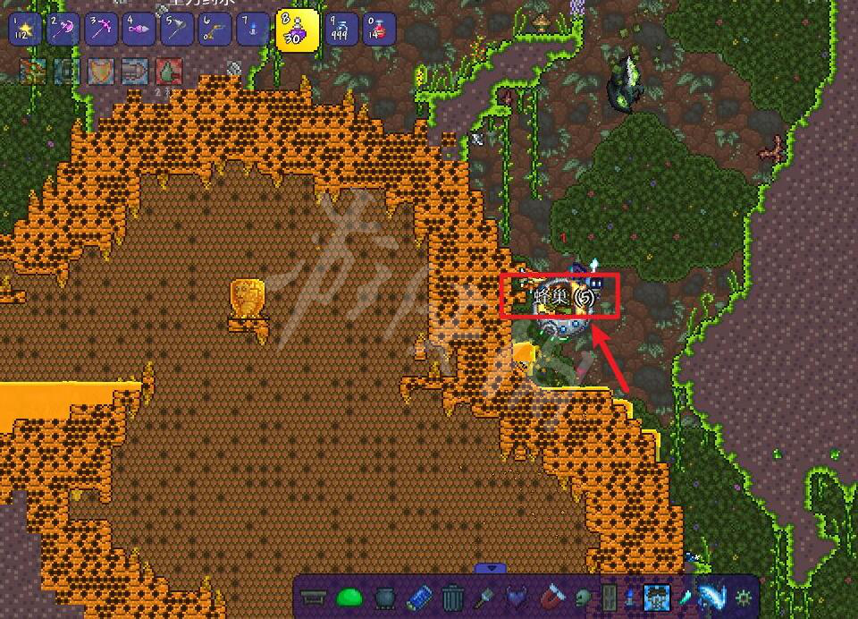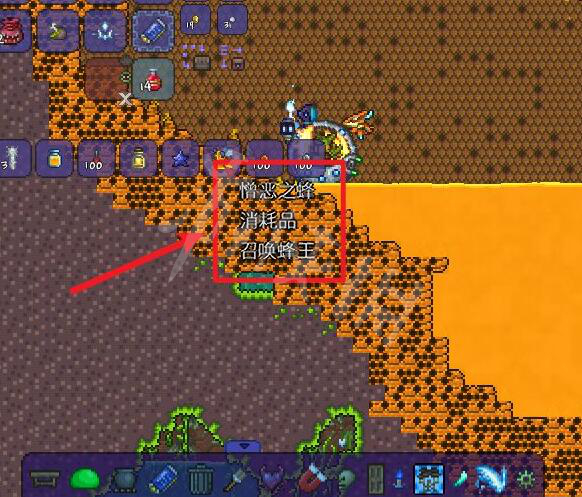 丛林底下的蜂巢。不过并不是在丛林下面一定会遇见,只是偶尔能够见到。怎么召唤蜂后——在丛林找到蜂巢之后撬开它,在这里面有一些含有蜂蜜和小蜜蜂的砖块。进入蜂巢之后,在蜂蜜当中找到一个方形的物品,如下图所示。找到之后敲碎它,很快蜂后就会出现