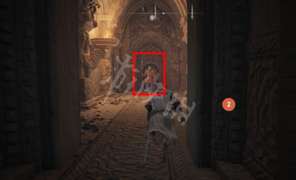 沿着通道一直向前,来到有一名士兵守门的房间。需要注意的是右手边的墙壁后面还有一名士兵。