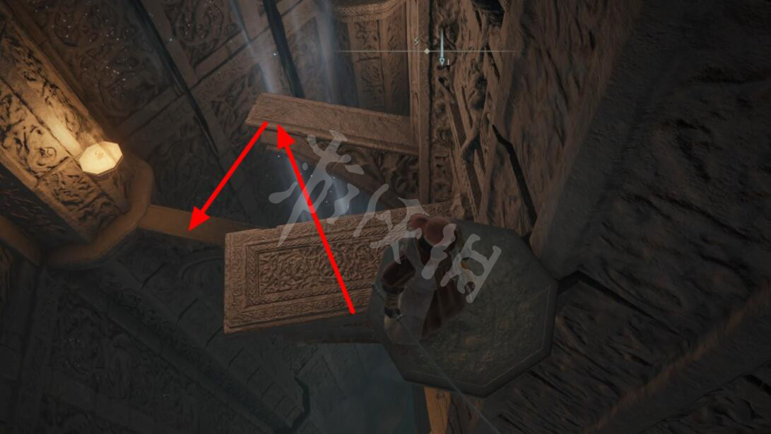 沿着墙壁边跳至另一个石梁上。