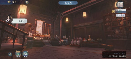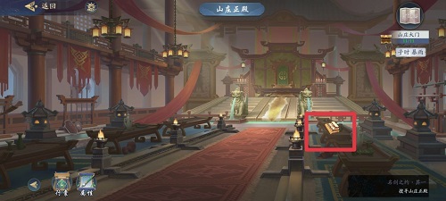 第四步,前往山庄正殿,利用钥匙打开山庄正殿。拾取地上破碎的纸条,开启隐秘通道。