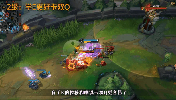 2.2级:E(3)技能的位移和嘲讽能让我们更好地用出上面介绍的双Q(1)连招,掌握主动权,向敌人发起猛烈的进攻吧!