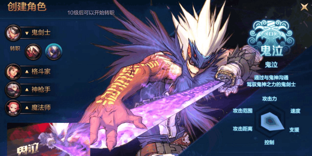 鬼武士:转职:鬼泣、狂战士,转职中鬼泣的强度上限低于狂战士,因此推荐转职狂战士,狂战士不怎么依赖装备,伤害却可以爆炸。
