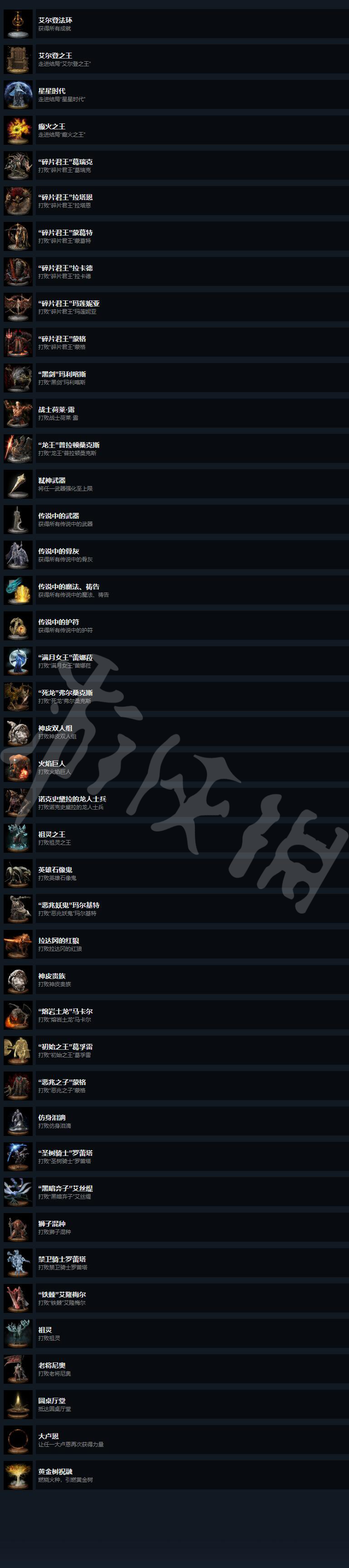 艾尔登法环steam全成就列表是什么?很多玩家还不清楚全成就有哪些,下面一起来看一下街机中国网小编带来的艾尔登法环steam全成就列表,希望可以帮助各位玩家顺利的知道全成就的内容。