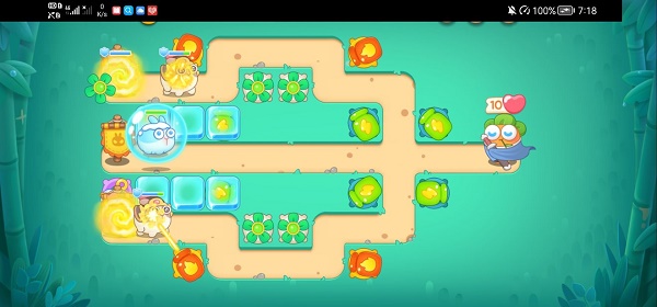 4.最后建四个火炮结束,满星过关,想要清除所有障碍,就建一些瓶子炮。因为中间两行会一直被冻住,可以不放武器,把武器放在最上最下两行【如下图】
