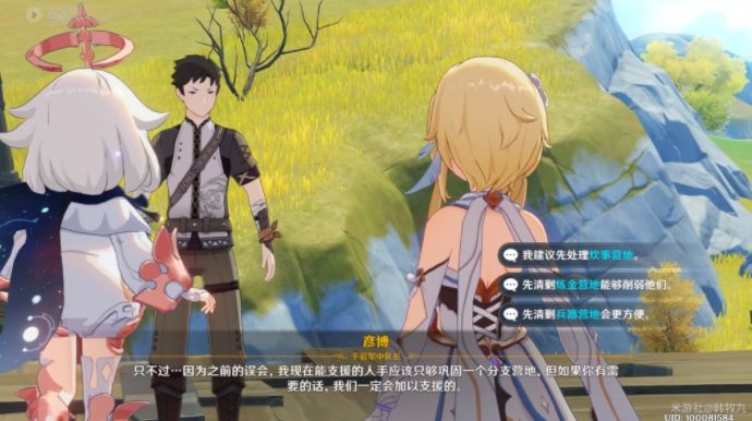 千岩军会帮助旅行者先清理掉一个营地(就是对话中选择的那个)。