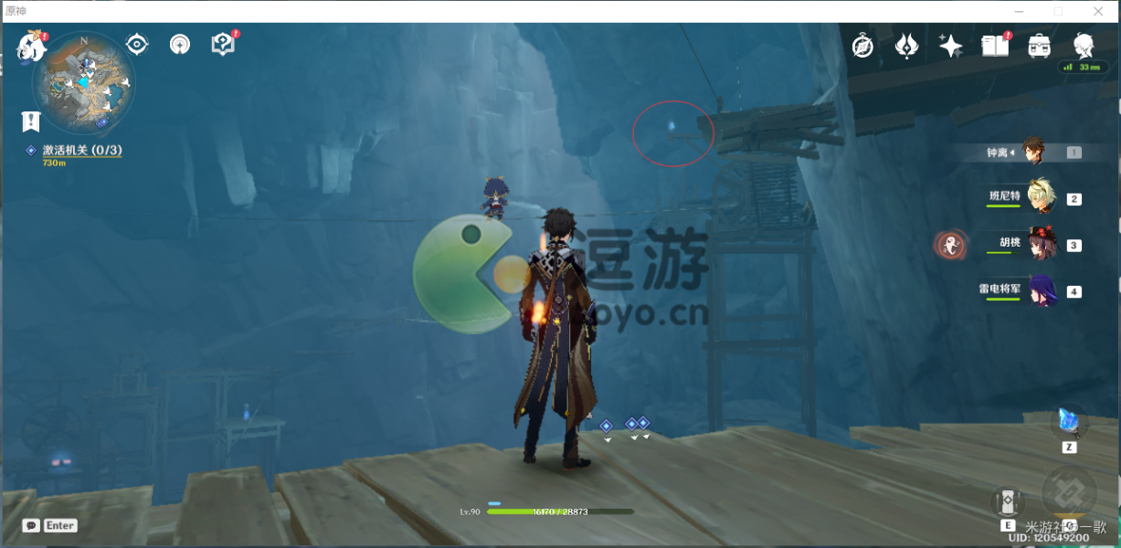 3.传送点往底下跳,有个小矿洞,往里走有个平台可以弹跳上去,然后会看到怪物镇守宝箱,往里走就是一个流明晶石还有一个仙灵,如下图