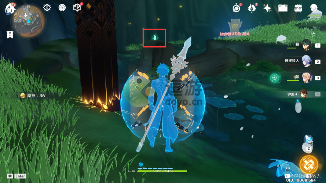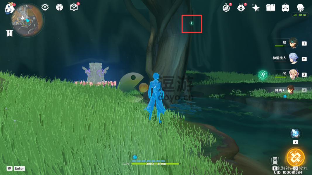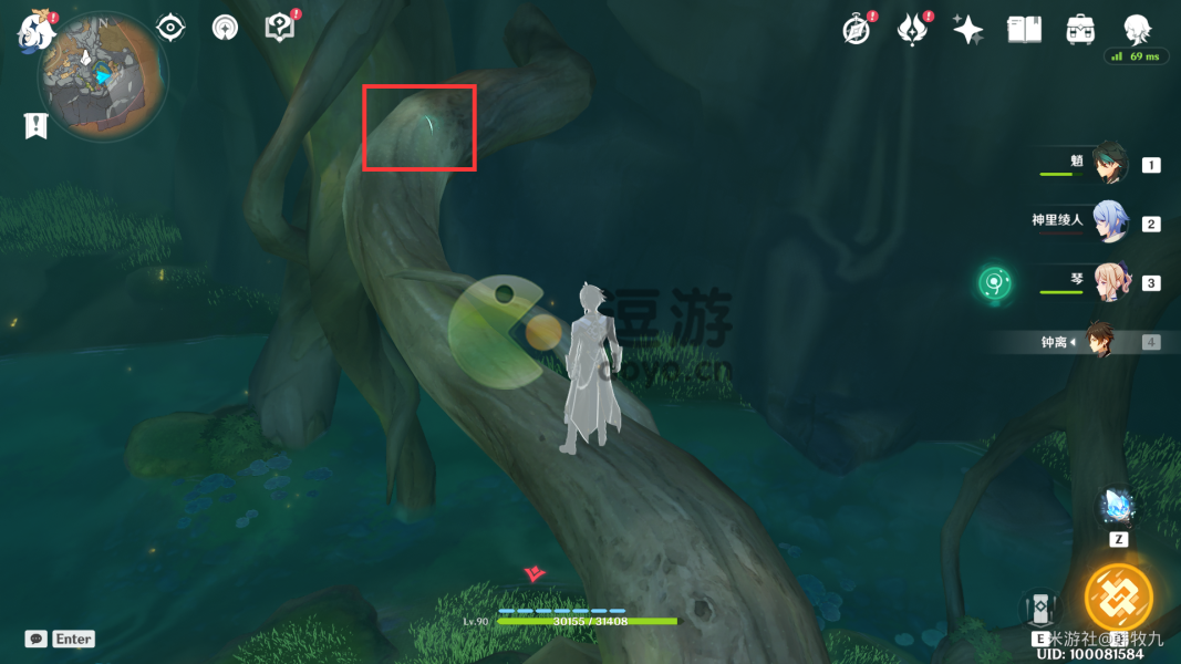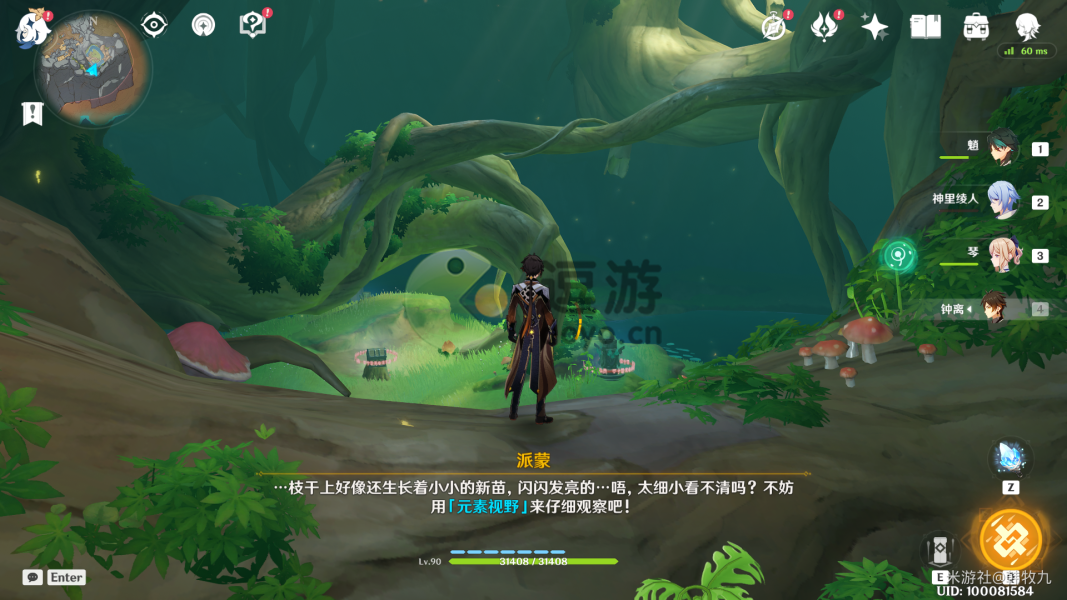3.通过派蒙的提醒,旅行者可以开启元素视野找树干上的新苗。