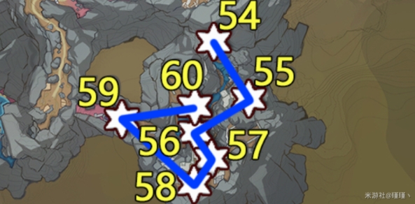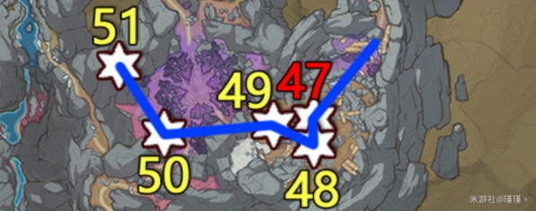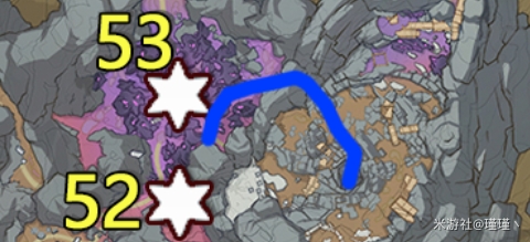 这里你只要主线推到无名遗迹下方,你从「崎岖石厅」下方传送点往右边石路上走就会触发魔神任务(大致路线如上),这样你就会上到倒挂的遗迹里面,根据任务提示你一直往上走就能开启一个倒挂的锚点,然后往右边断裂的石板上飞,经过缠绕着的粗树枝就能看到52号点位;