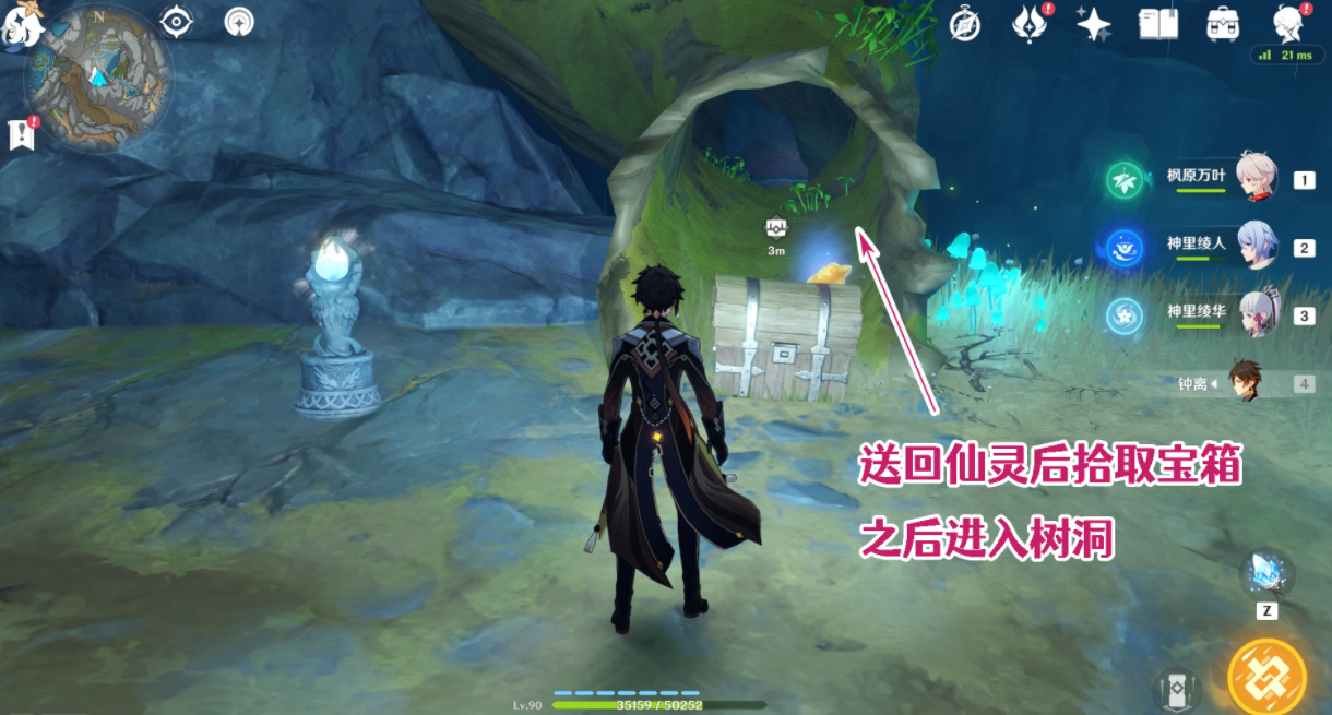 将这里的仙灵送回到仙灵台座,会出现1个普通的宝箱。而在拾取宝箱的时候,我们就会自然而然的注意到这里的树洞,捡完宝箱后,我们就需要进入这个树洞内。