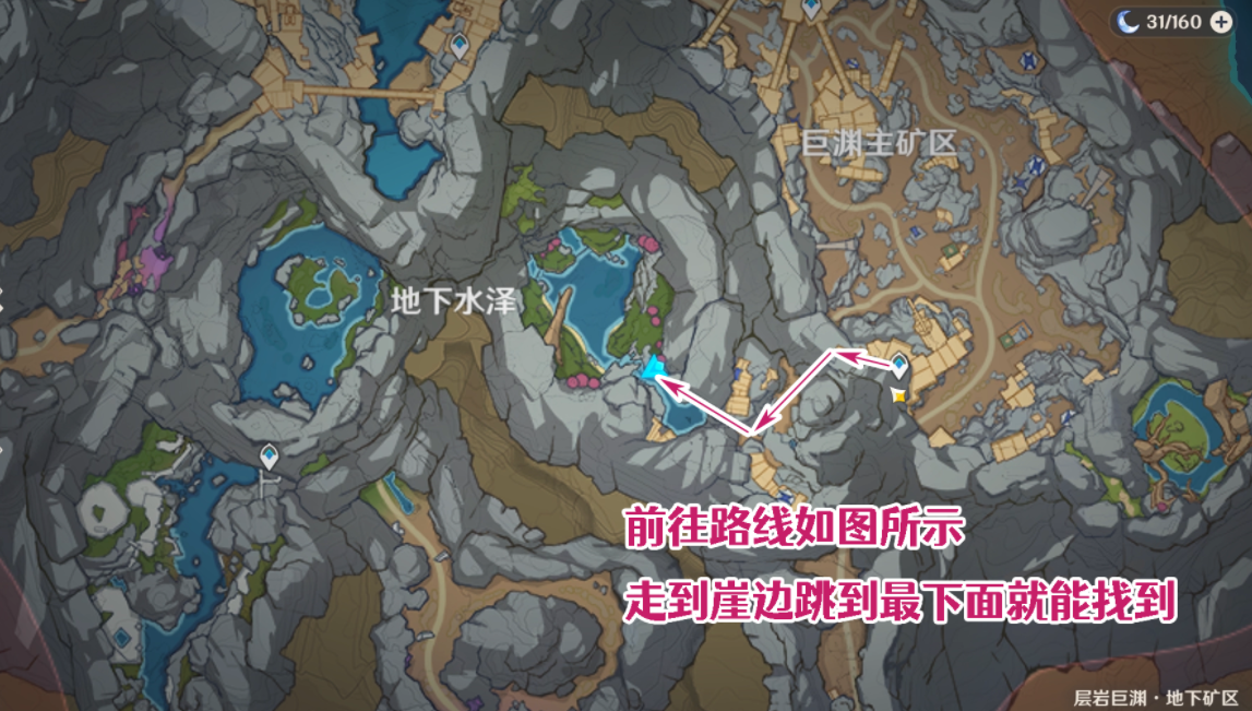在层岩巨渊地下矿区的地下水泽区域,我们可以在图示位置找到1个观景点,旁边还有1只仙灵。
