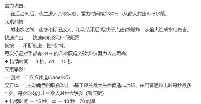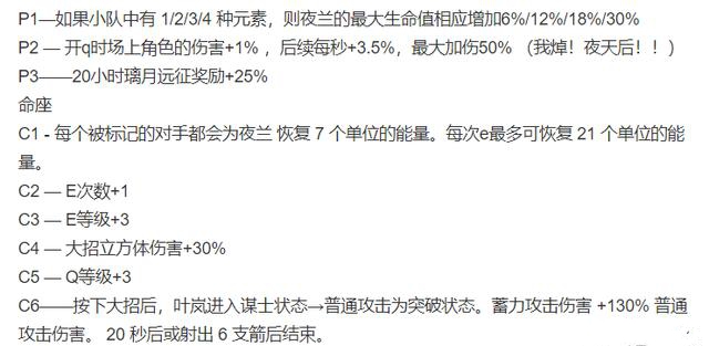天赋一断绝了夜兰组成水系纯色队的可能性,会根据队伍元素数量增加夜兰生命值;天赋二让夜兰在开启大招后为前台角色增伤,随时间线性上升,可达到50%。关键命座1、4,分别是加充能、增伤,6命解锁主C模式,不是很必要。