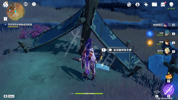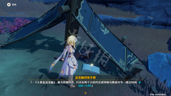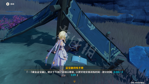 3、 到达任务区域在一旁的营地中有一本《盗宝鼬训练手册》(不想看的直接看下文即可),阅读后来到图中大石头处根据《盗宝鼬训练手册》的内容调整时间并吹口哨