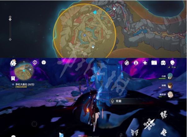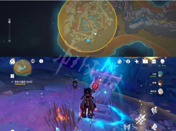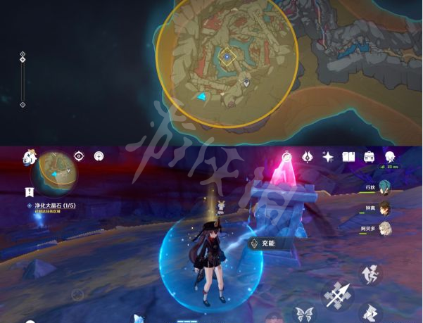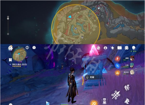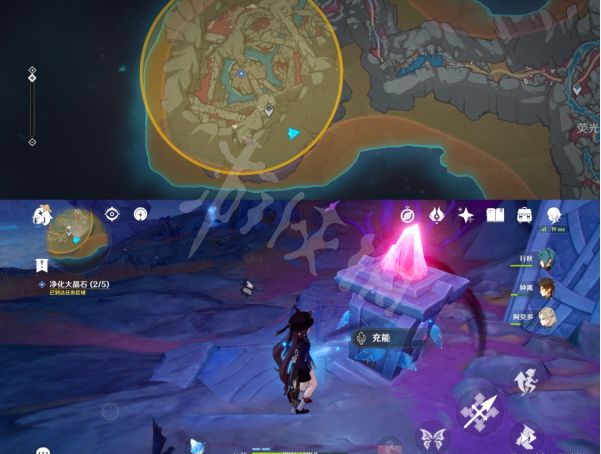 8、沿着地图右边一直走后拐弯在一直走找到第三个点位的大晶石,同理净化即可。