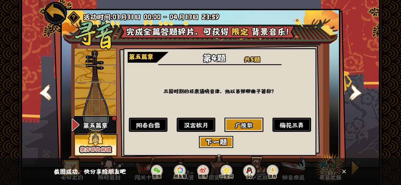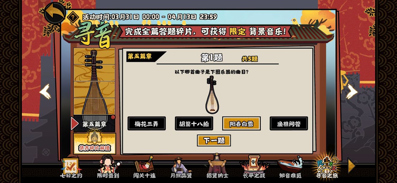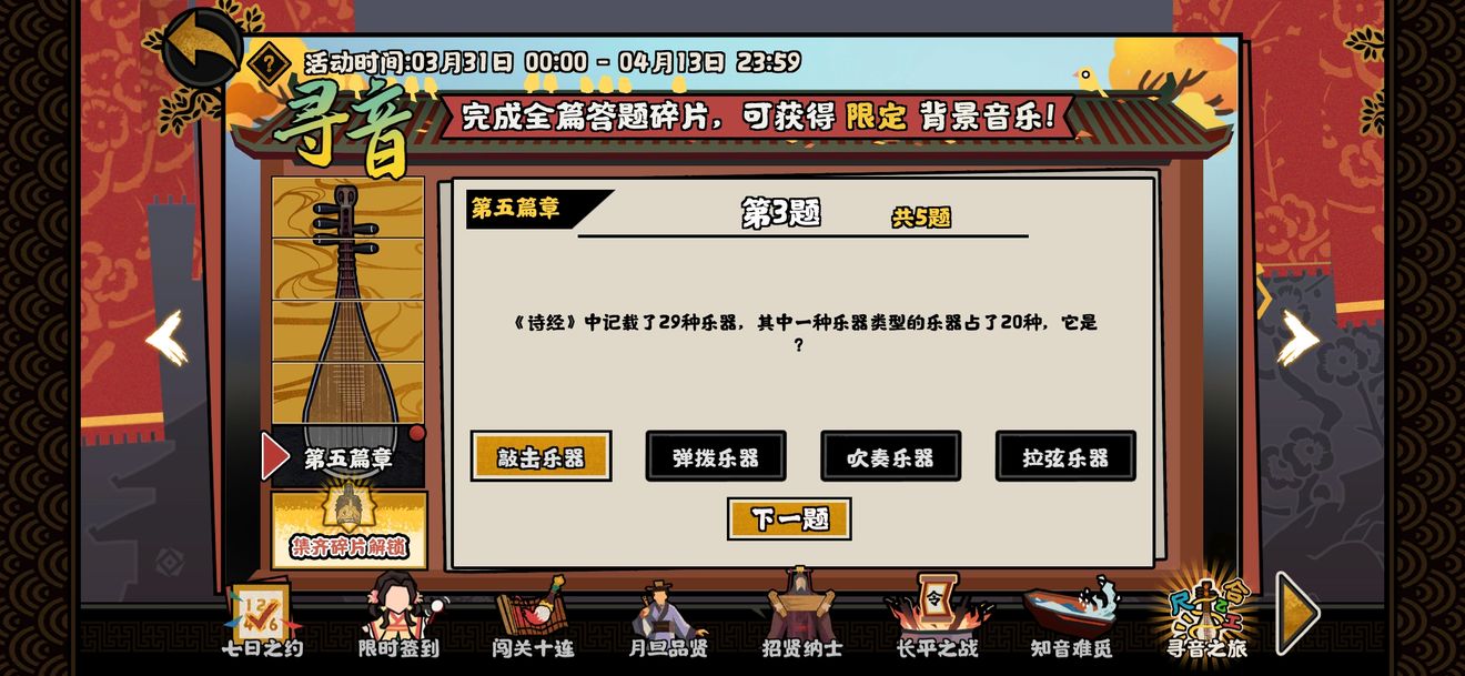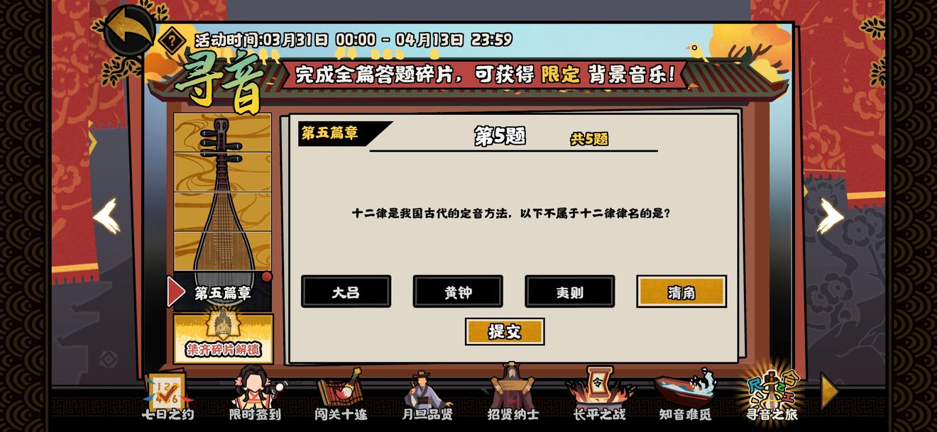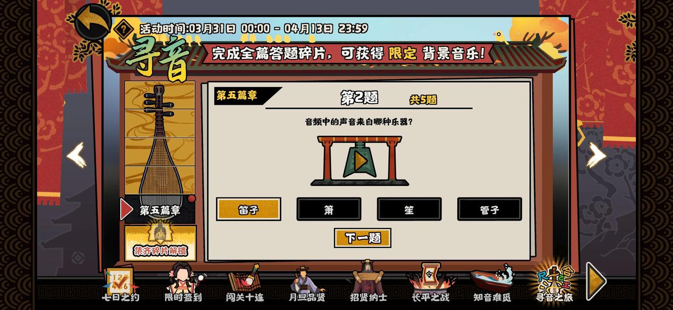 无悔华夏寻音之旅第五篇答案是什么?寻音之旅是无悔华夏近日在游戏中开启的新活动,玩家需要回答历史上关于音乐的相关知识,那么寻音第五天答案是什么呢?下面就让小编为大家介绍一下吧。