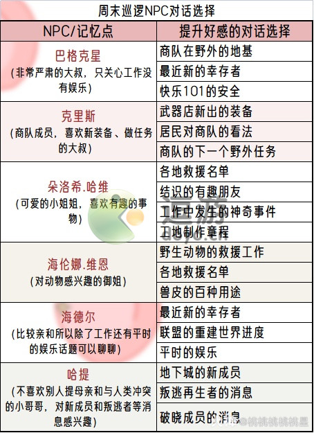 3.以上就是明日之后周末巡逻npc对话选择攻略,有用的话就收藏下来吧。