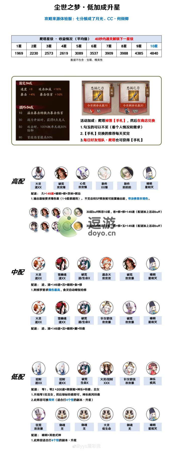 1.分[爬塔攻略]、[第一天升星阵容]、[高星速刷阵容]、[凋零之梦阵容],面板图可以翻翻主页帖子