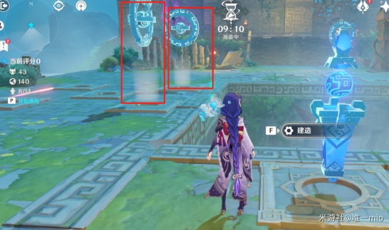回到起点等待奇幻点达到200,在下图位置建造一座水塔、一座冰塔