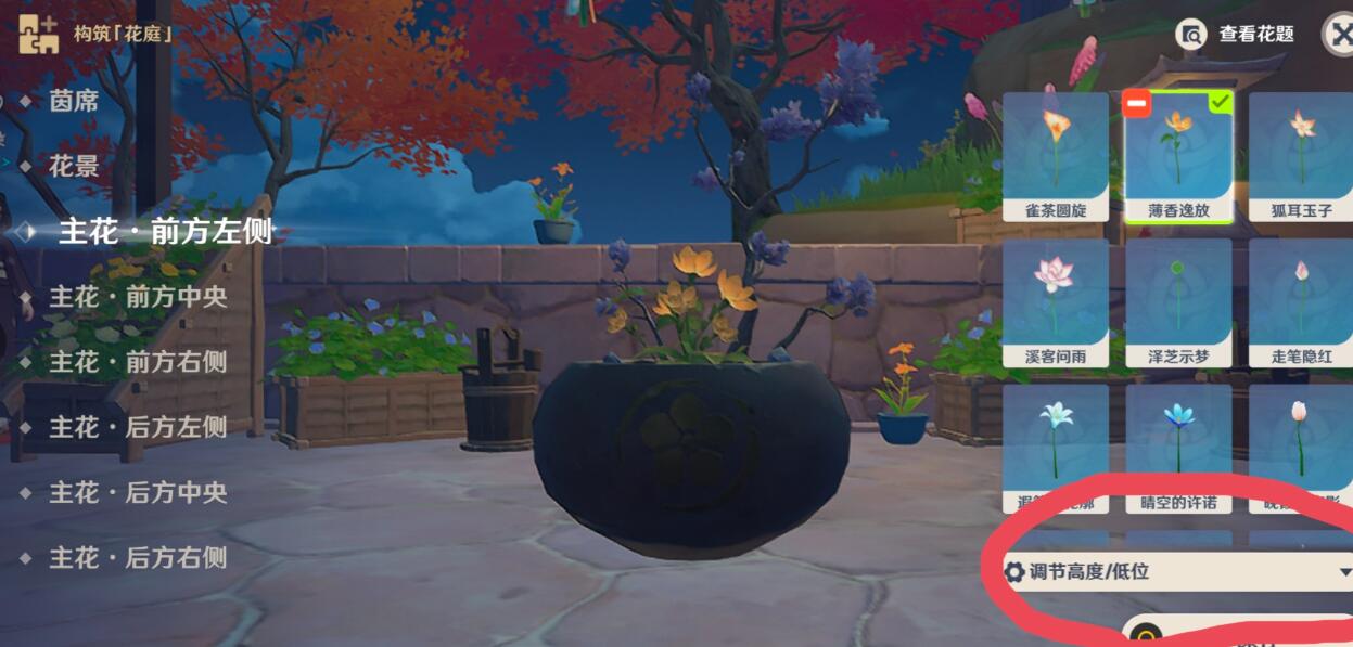 3.「主花」以前方左侧为例,选下图最上方第二个,并且注意要调节高度/低位这很重要,否则只选对花完成不了。(每个花部位都选薄香逸放)。