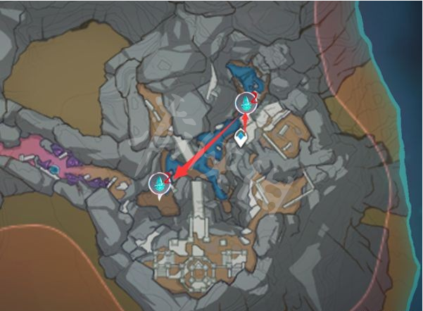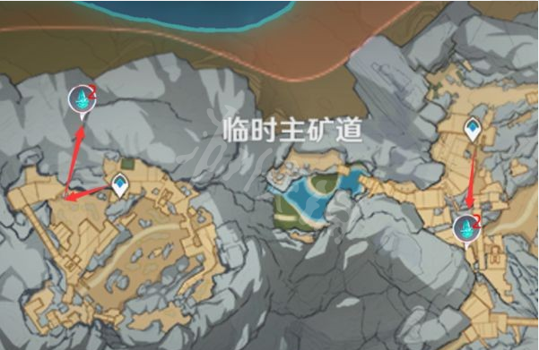 此处先往秘境外面走,开采两个点位后再次传送回来,跳下地下矿道,开采剩下的两个点位。