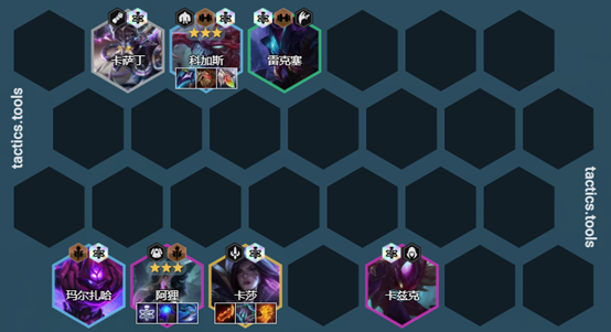 卡莎是5费橙卡,羊刀叠加攻速,鬼书减疗,最后再加一个保命装备完美。