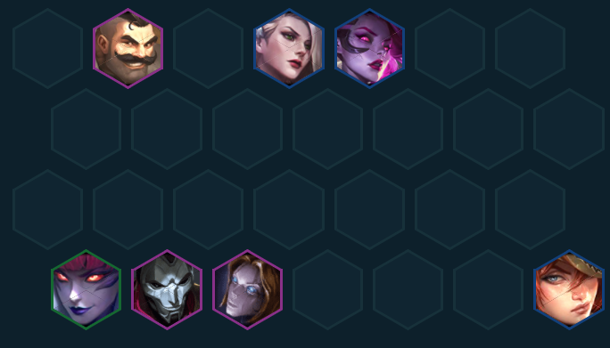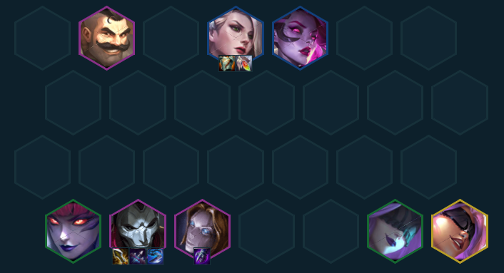 决赛圈直接上九找五费外援,单挂塔姆、杰斯、卡莎、爆爆都可以,如果有相关执事/精密/狙神/学者的海克斯或是转职可以考虑拆掉低质量卡换人或是开出相应的高羁绊。