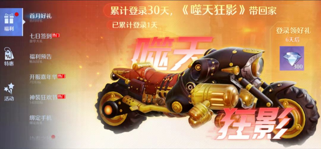 累计登录30天,首月绝版好礼摩托车:噬天狂影等你来领!