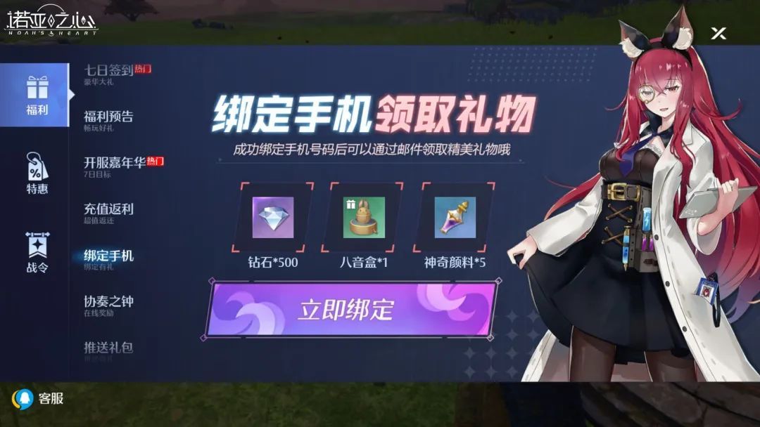 绑定手机即可获得500钻石、八音盒、神奇颜料等奖励,成功绑定后记得去邮箱领取精美礼物哦~