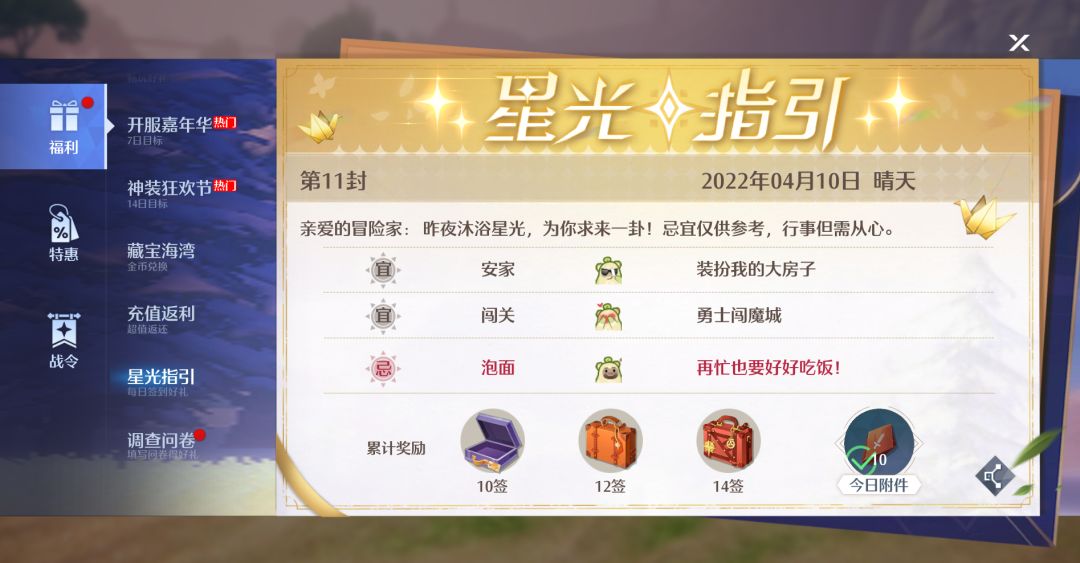 每日查看运势,可领取奖励,签到累计到一定天数,还可领取钻石、幸运硬币。忌宜仅供参考,行事但需从心。