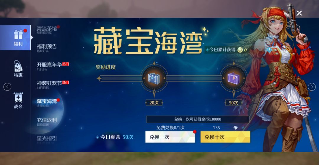 前往藏宝海湾,每日可免费领取一次金币,每日兑换达到20/50次可另外获得金币,越换越多,从此金币不用愁!