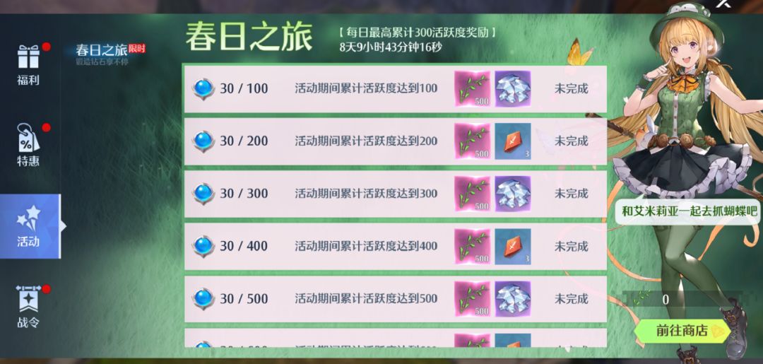 开服第二日开启,每日完成活跃度任务,活跃度累计目标达成后即可获取活动商店货币【旅人的青枝】,届时,冒险家们就可以前往活动商店“春日小屋”购买各类春季好礼:觉醒卷轴、灵魂契约、传奇幻灵水晶、装饰、幻灵信物……超多奖励,还不赶快来抢购!