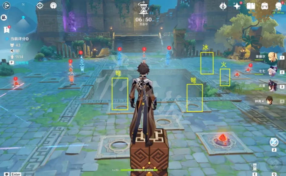 如下图,开始在入口位置2个火拆掉,前面中间的2个震弩拆掉,然后红色标记7个点摆上机关,即可开始,等攒到积分了,先摆右边的冰和火机关,然后再摆入口处的2个震弩机关。全部摆完即可挂机拿满3000分了。其他不用摆。