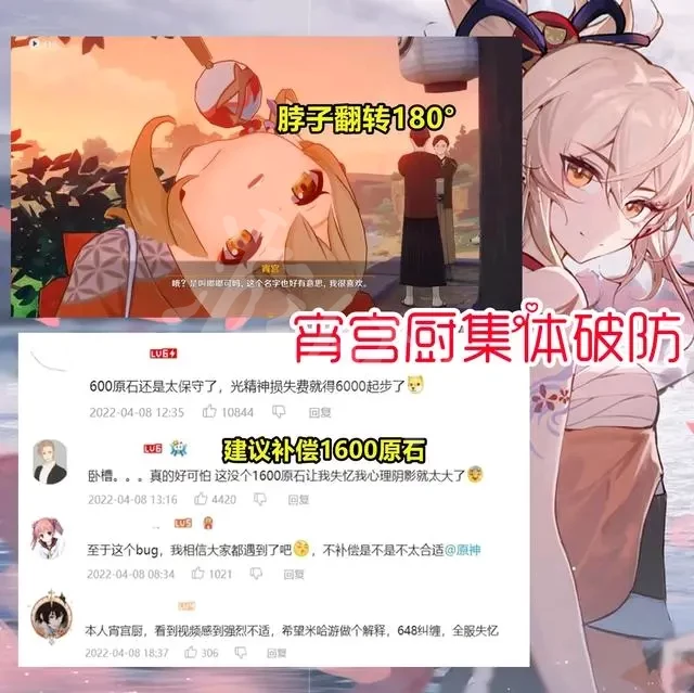 近期还发现了一件让宵宫厨集体破防的事情,起因是位玩家在过任务时遇到了奇葩bug,这个歪头杀bug甚至让这位玩家吓得不轻,按常理来说这种bug一般是出现在npc上,很难会在主角色上,所以不少玩家纷纷表示让米哈游赶紧补偿原石奖励。