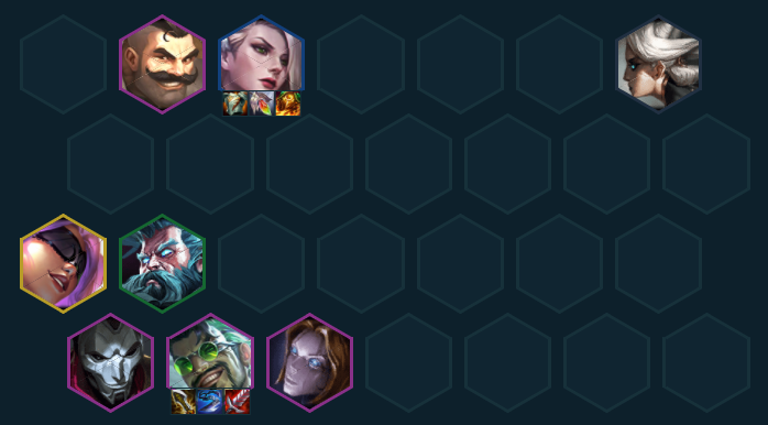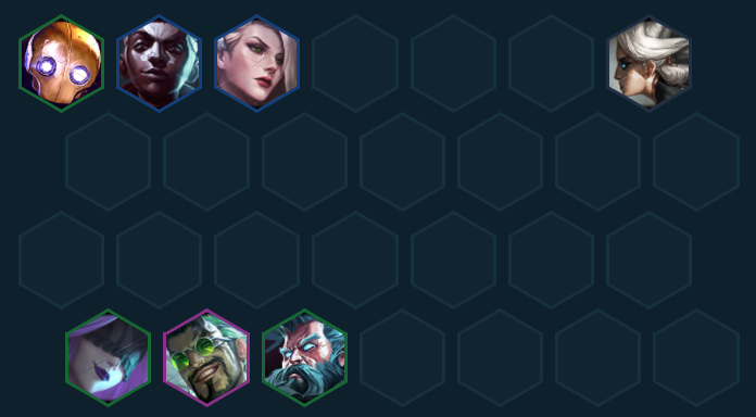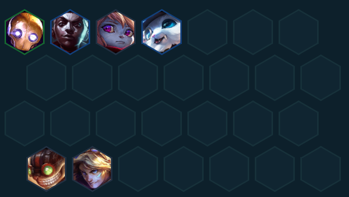决赛圈直接上九找五费外援,单挂塔姆、杰斯、卡莎、爆爆都可以,如果有相关执事/挑战/精密的海克斯或是转职可以考虑开对应的高羁绊,总体思路围绕着增幅和保护德莱文和泽丽两个大C去构筑阵容即可。