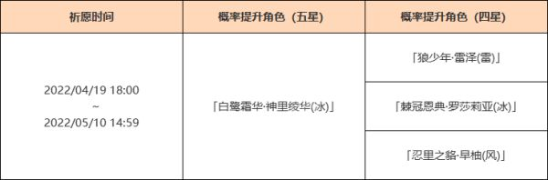 活动期间,四星角色「狼少年·雷泽(雷)」「棘冠恩典·罗莎莉亚(冰)」「忍里之貉·早柚(风)」的祈愿获取概率将大幅提升。