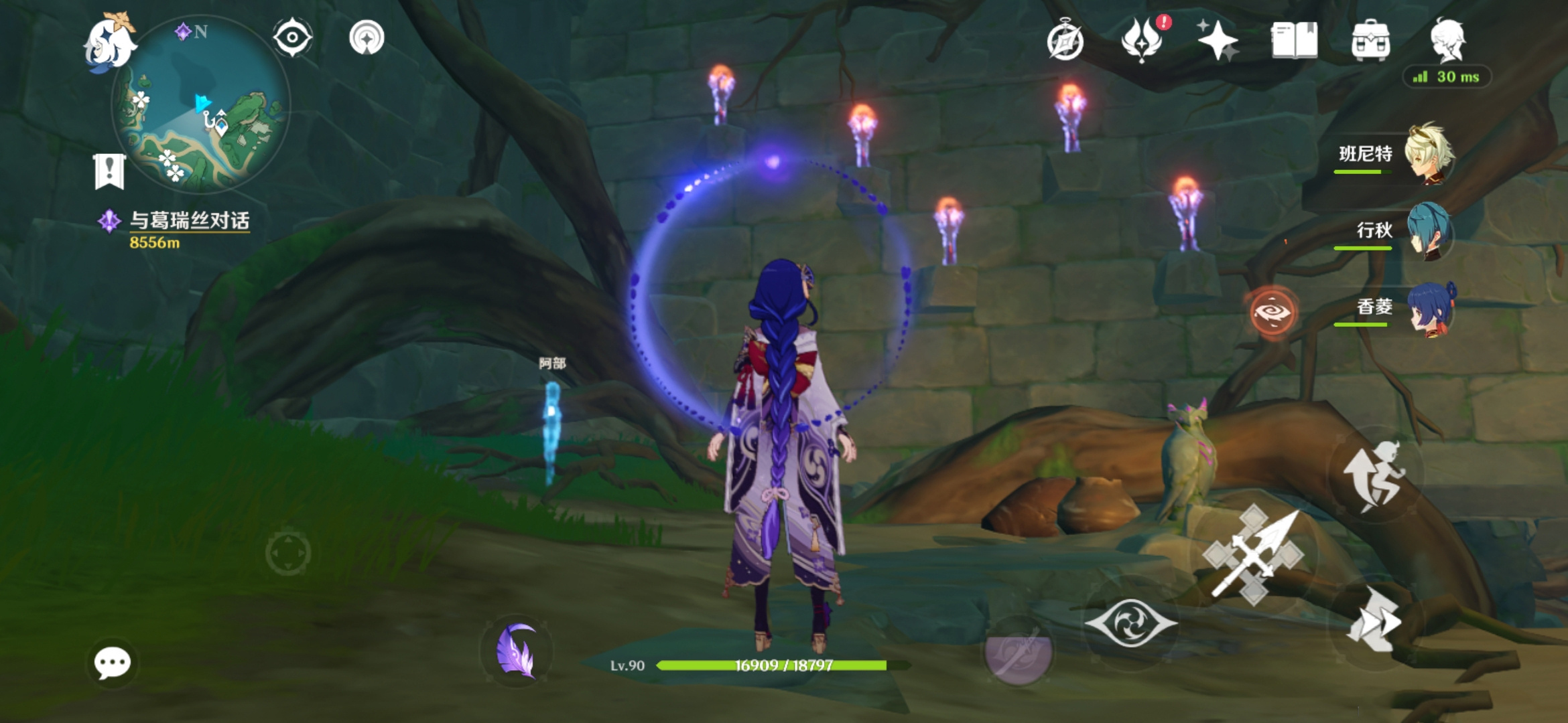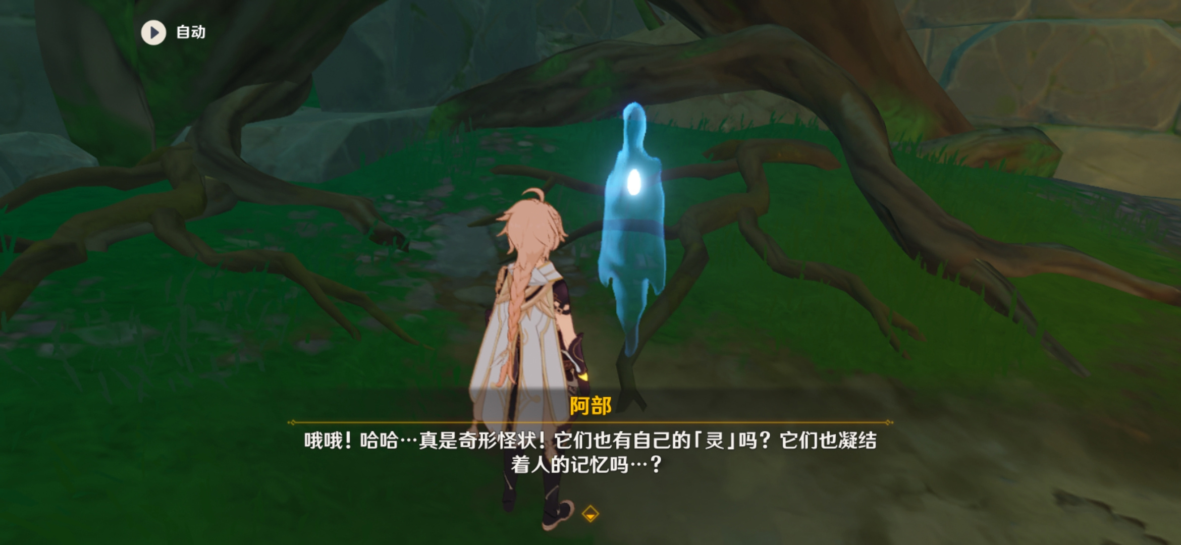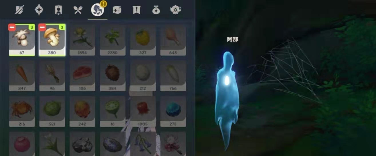 来到我们看到图的位置,相信这里火把做过之前任务的小伙伴已经点亮了,我们现在注意小鬼魂位置应该是一堆“幽灯蕈”,第一次采冒出一次小鬼魂阿部然后就消失了,等第二天再来采集时候阿部就出现了。
