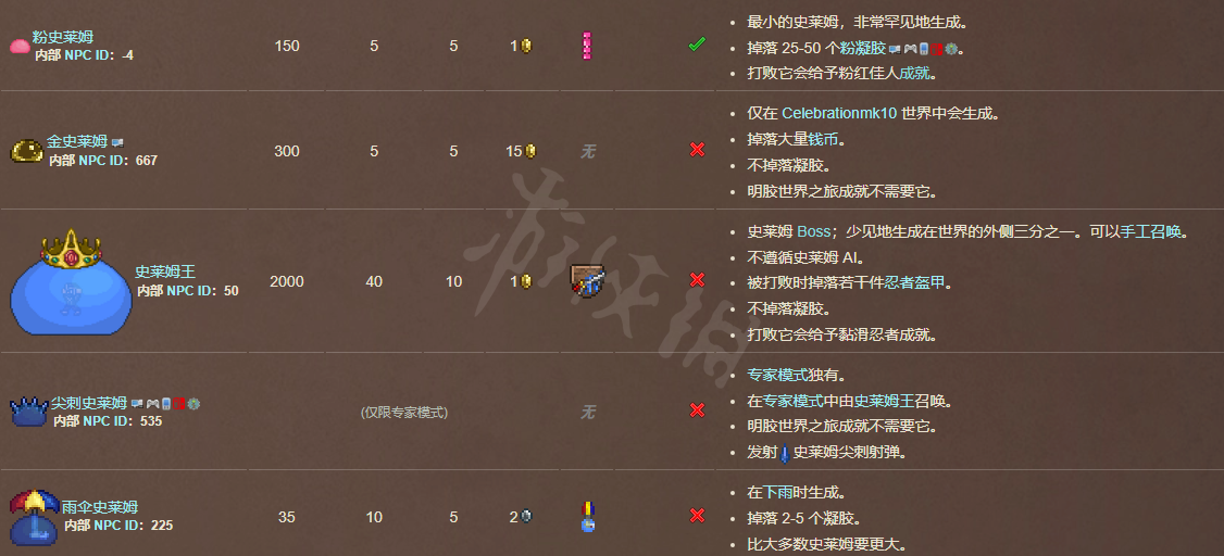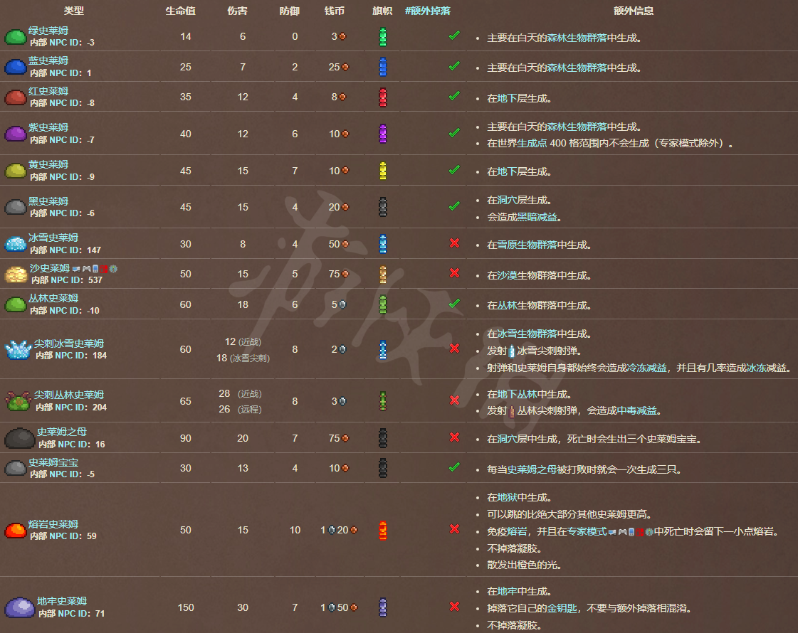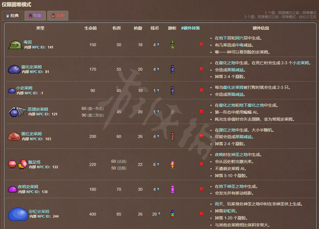 其中有七种史莱姆是困难模式(肉山后)刷新的、三种是腐化之地地图独有的、一种是猩红之地地图独有的。