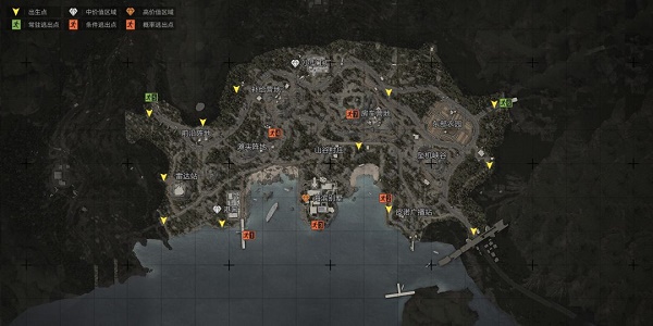 1.地图东北、西北两侧有两个常驻撤离点。出生在东侧的先锋需要前往西北撤离点,反之亦然。地图南部的港口和皮诺广播站附近的撤离点为概率开放。房车营地的撤离点需要携带近战武器登山镐,滩头阵地处的需要避难所钥匙,海滨别墅中的直升机撤离点则需要先锋上交两个身份牌才能发动。