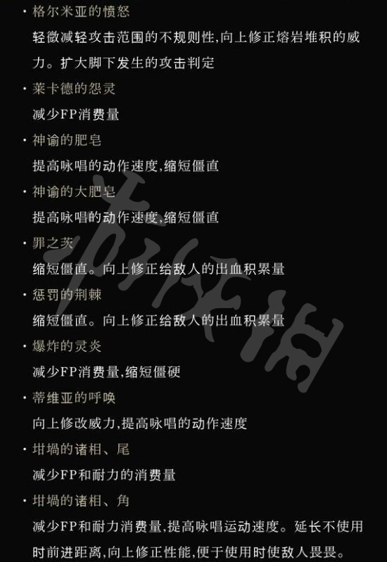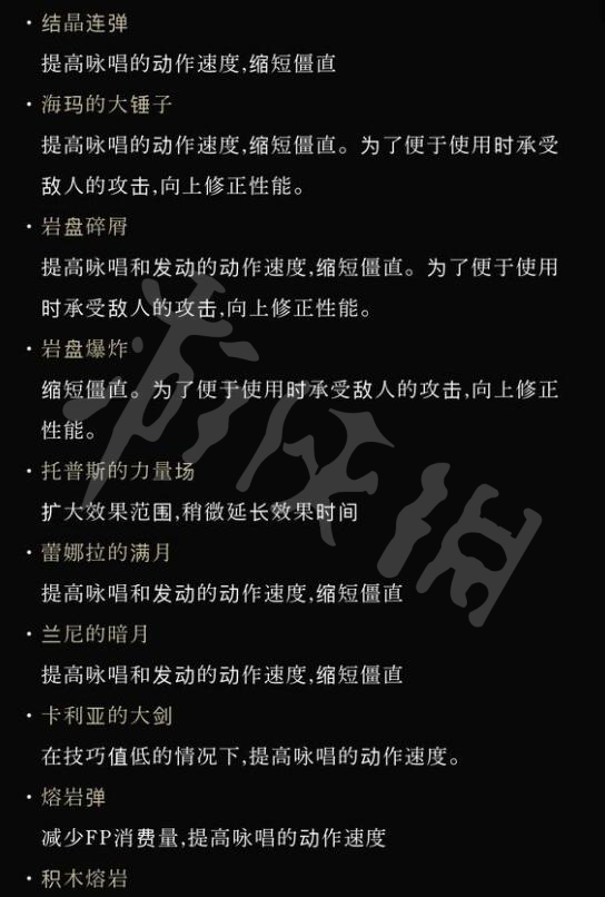 古龙雷枪-降低了FP和耐力的成本。提高铸造速度,减少恢复时间。允许施法者在铸造时更容易抵御敌人的攻击。