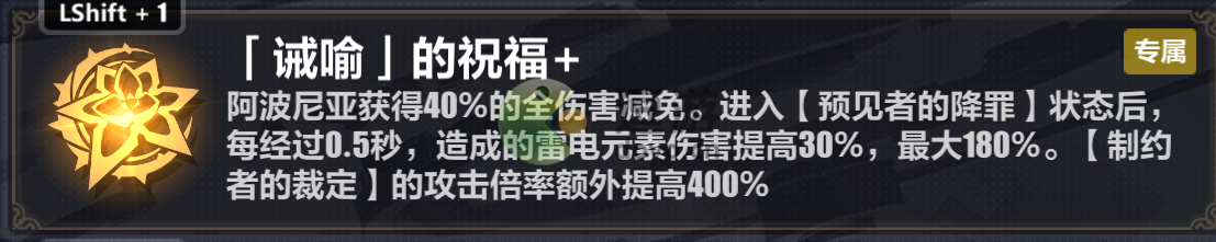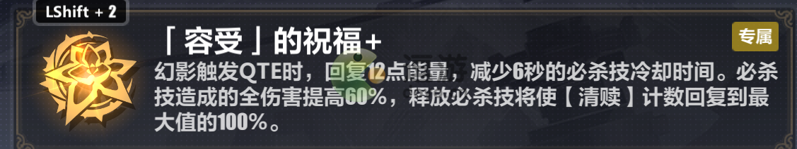 4.【容受】的祝福:减少必杀技cd时间,加快技能循环,增加必杀技伤害,回复【清赎】计数条,优化了阿波尼亚的循环,推荐后期拿取