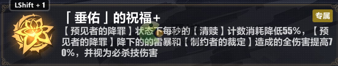3.【垂佑】的祝福:减少【预见者的降罪】状态下的【清赎】计数消耗,提高分支攻击伤害,建议开局拿取