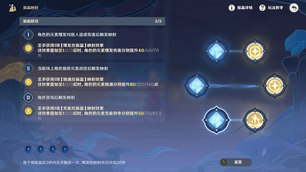 振晶映射:上下半场的振晶联结映射均为全横选,即: I爆发响振晶→爆发应振晶(角色元素爆发对敌人造成伤害后触发映射效果,叠加1 层,角色元素爆发伤害提升40);