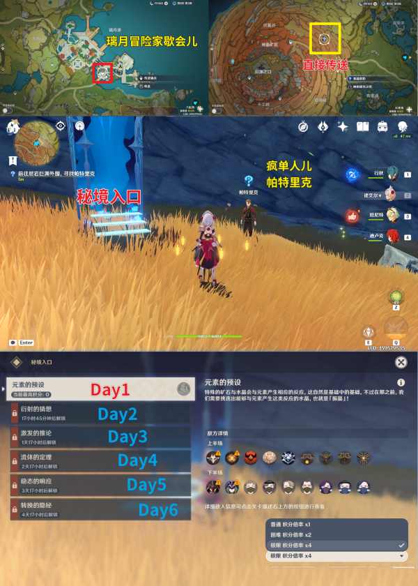 Day 1 【元素的预设】首先与璃月冒险家协会凯瑟琳交谈,然后直接传送至层岩巨渊新开秘境锚点,与NPC 帕特里克对话开启任务后,进入秘境第一个挑战【元素的预设】,选择积分倍率x4,进入单人挑战。