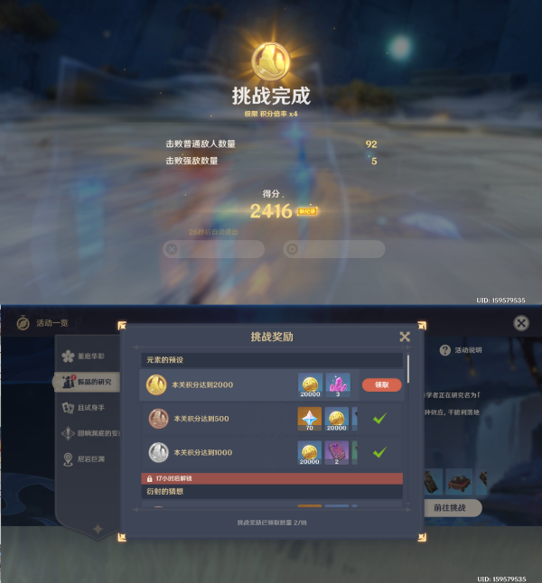 本期活动最快6天打满,全部奖励包括70原石x6天=420原石,以及总计36万摩拉,12 本4星经验书,18个精锻用魔矿,以及若干武器强化素材,获取每天的秘境挑战全奖励的最低要求是达到2000分。个人感觉活动难度 “非常简单√” 。