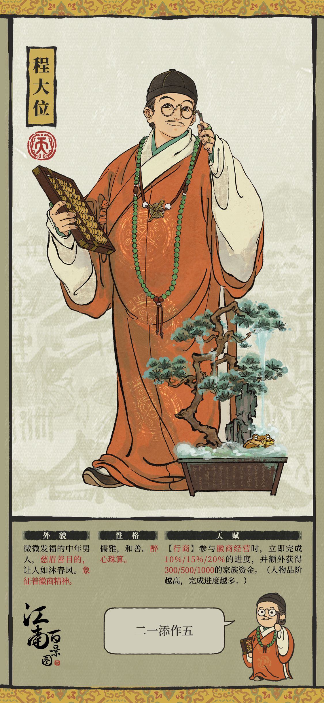江南百景图程大位怎么样?江南百景图天级角色程大位怎么样,大家知道程大位天赋是什么吗?下面快跟随街机中国小编一起来看看江南百景图程大位详细介绍吧。