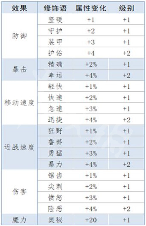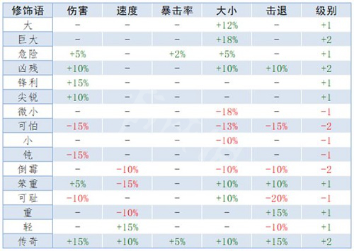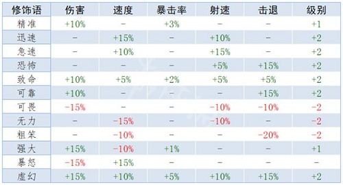 2.相较于饰品词条,武器的词条要复杂的多,一个词条往往涉及多个属性的变化。第一类武器词条称为通用词条,连枷、矛、悠悠球、回旋镖、链锯、钻头(包括斧钻)和叶绿手提钻只能拥有通用词条,因为它们的速度无法改变。以下列出通用词条表。